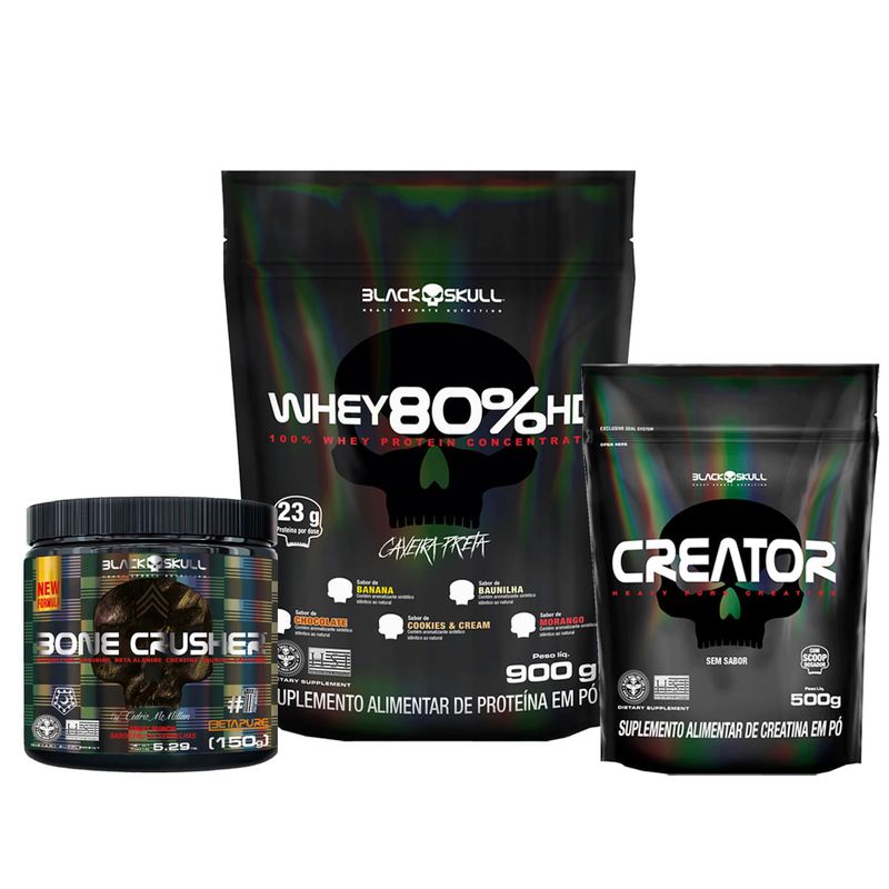 Kit Whey 80% HD + Creator 500g + Pré-treino Bone Crusher Fruit Punch 150g - Black Skull
